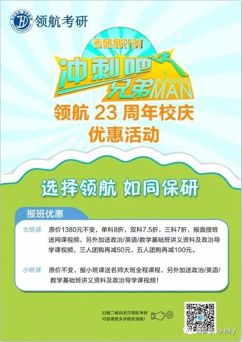 ☞☞☞转发集赞,每个赞可抵课程费用5元,100个赞封顶! ☞☞☞报班优惠,最低七折;报小班送大班。 ☞☞☞助研名额,每班两人,限成绩优秀或家庭条件有限的学生。 ☞☞☞校庆优惠,政英三人同行,一人免单;数学五人同行,一人免单,时间:5月19--5月27。 ★★★诚聘优秀学生代理。 暑假马上来临, 考研得暑期者得天下! 快速提高基础 先报名优先排座位 同学抓紧时间预约哟! 领航考研暑期强化班火热报名热线: 0731-89906232 13618483177 名额有限,先报先得!